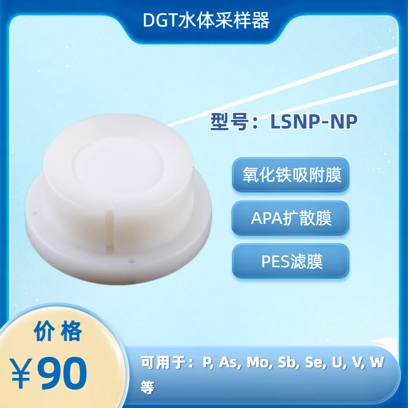 测量磷和氧离子形式存在的金属,包括 砷、钼、锑、硒、铀、钒、钨(Zhang et al., 1998, Luo et al., 2010, Osterlund et al., 2010)。适用于含 0.8 mm APA(聚丙烯酰胺)扩散凝胶、聚醚砜滤膜和氧化铁构成吸附膜的水体DGT装置。